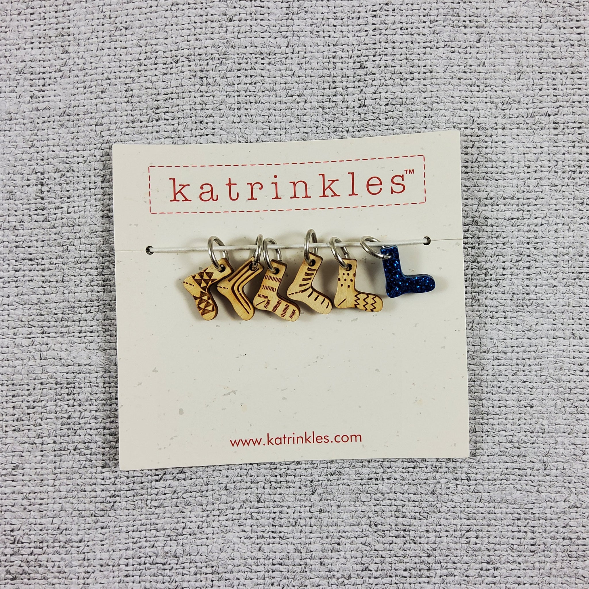 This new Tiny Sock Stitch Marker set features five wooden socks engraved with groovy patterns and one in fan-toe-stic blue glitter.